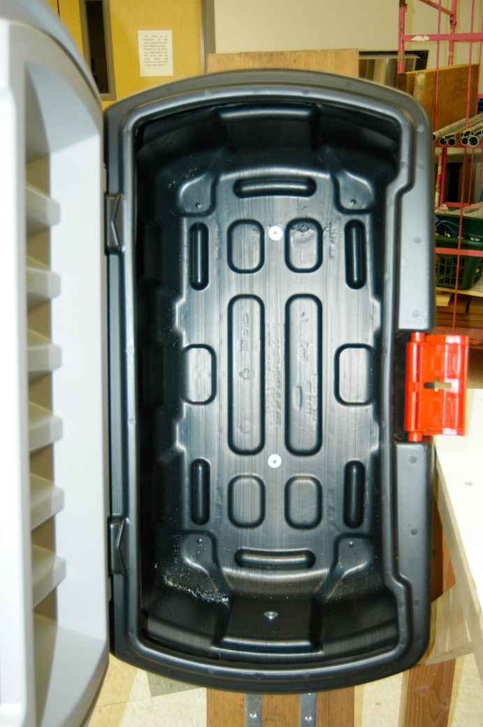 Caption: Here is the initial view of the actionpacker mounted to the pressure treated 2x12. Note the fender washers and wood screws holding the actionpacker against the pressure treated 2x12.